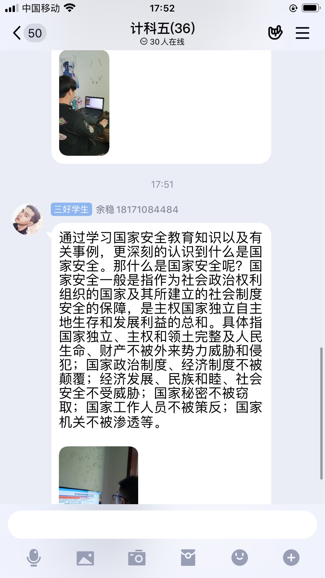 2020年4月14-15日,组织学生观看了全民国家安全教育日的公开课和直播课,让我受益匪浅,也对国家安全有了全新的认识。国家安全包括政治安全、国土安全、军事安全、经济安全、文化安全、社会安全、科技安全、网络安全、生态安全和资源安全。国家安全是国家生存和发展最基本、最重要的前提。它关系国家稳定,关系社会长远发展。通过这次新冠肺炎疫情的爆发,也可以看出我国各种可以预见和难以预见的风险因素有很多,维护国家安全和社会稳定任务繁重艰巨。从这个意义上说,维护国家安全既是国家责任也是公民责任。虽然全民国家安全教育日只有一天,但是,平日我们就应该加强国家安全的重要性的宣传,把国家安全认识的种子播种在学生心中,让大家居安思危,虽处和平年代,但也不能忘记潜在的威胁。国家之安,人民至上。维护祖国和平稳定,人人有责!