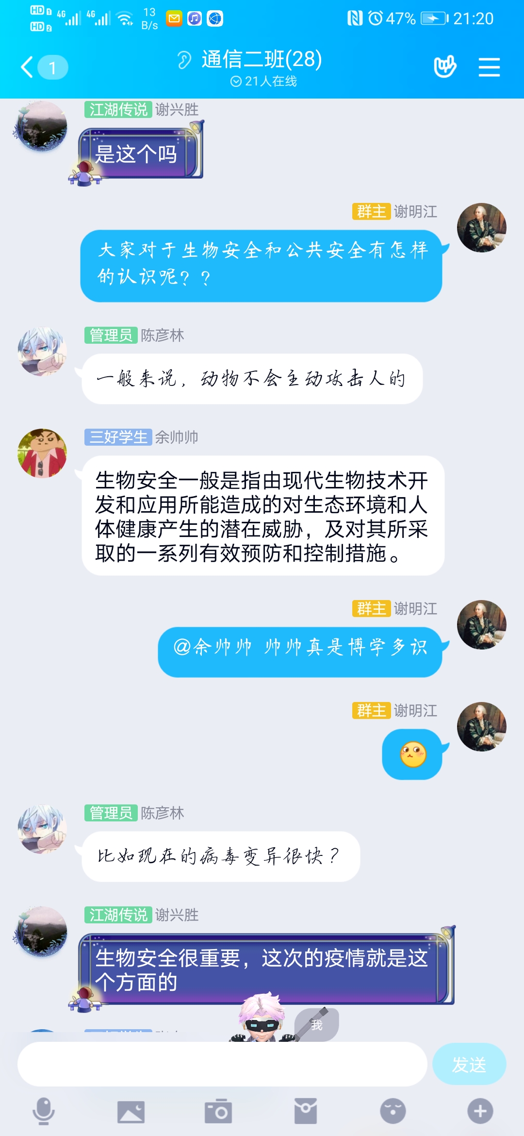 4月15日的《同上一堂国家安全教育课》课堂主要以国家安全教育、生物安全为主要资料展开。首先,贴近实际的事例、丰富的国家安全知识资料不仅仅让同学们了解到身边的国家安全隐患,更让大家意识到国家安全教育的重要性。经过学习,同学们意识到平时必须要注意国家安全的方方面面,千万不能做有损国家安全的事情。