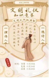 因此为了提升我院学生的文明礼仪素质,丰富校园文化生活,创建美好生活空间,营造良好的.学习氛围,倡导文明,展现大学生的风采,引导学生发挥“自我教育、自我提高、自我管理、自我服务”的作用,促进大学生综合素质的全面发展。我校将在11月10日举办文明礼仪知识竞赛的活动。