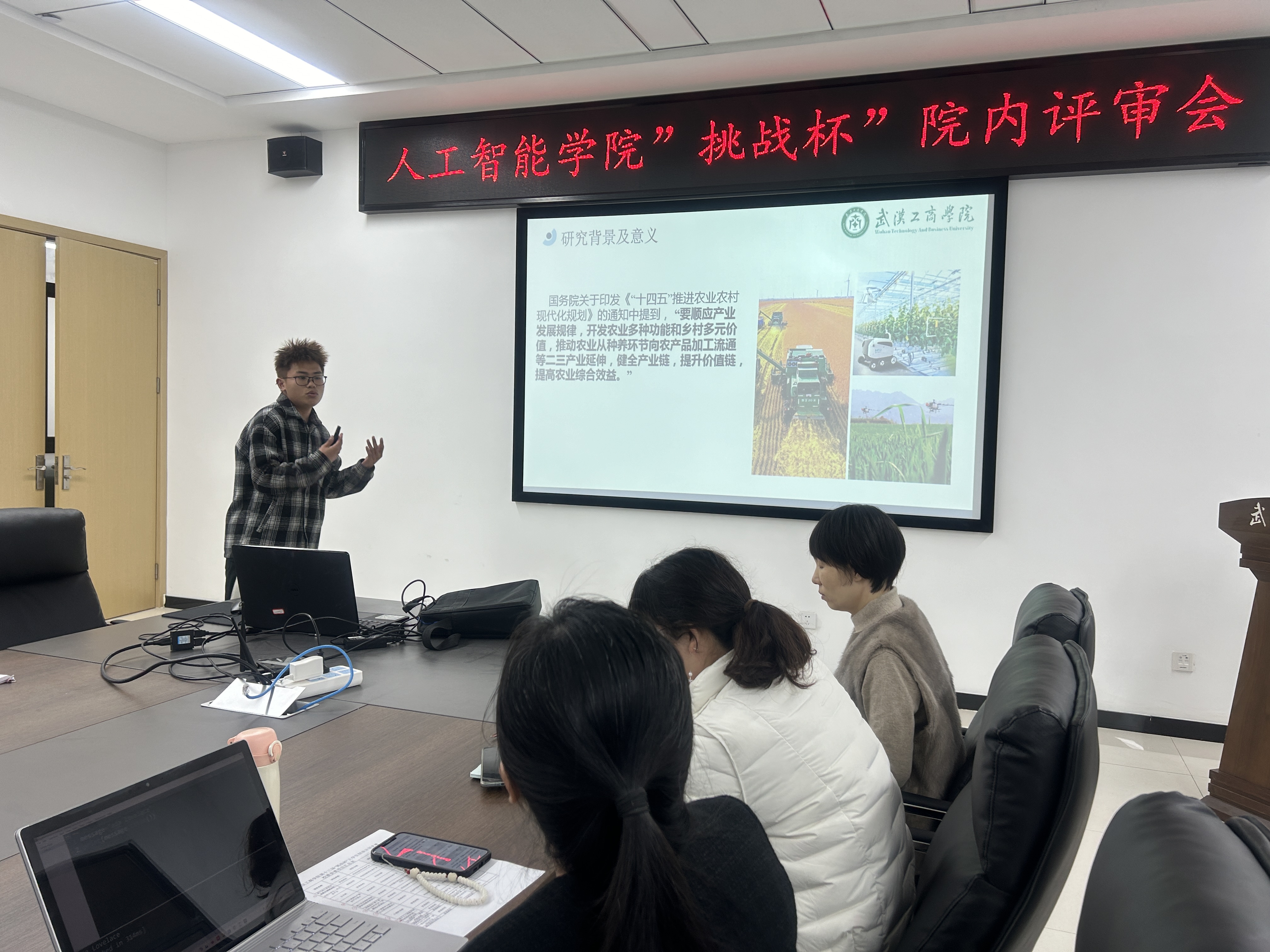 2024年3月15日上午,人工智能学院在15栋315会议室举行了第十三届“挑战杯”院内评审会,评委由学院副院长彭敏和学院竞赛指导委员会、分团委书记肖宁等组成,共有13支学生团队参与。