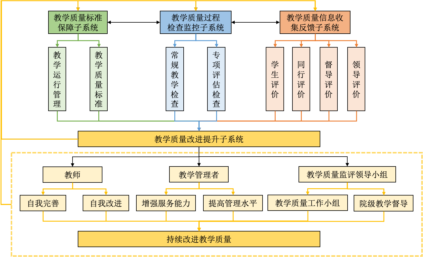 学院建立多方面的反馈机制,构建涵盖教学质量标准保障、教学质量过程检查监控、教学质量信息收集反馈及教学质量改进提升等四个子系统的教学质量闭环监控体系,如图1所示。