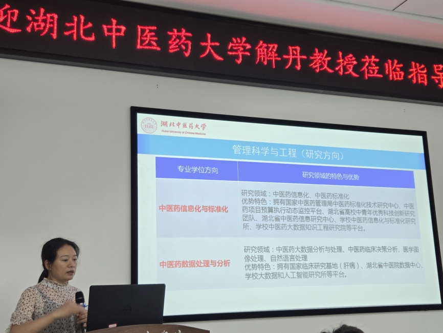 解丹教授从三个方面展开:一是详细介绍了国家大力扶持中医药事业发展的政策红利和“十四五”中医药发展规划。二是介绍了湖北中医药大学的基本情况,以及信息工程学院研究生的招生与培养情况,包括该校学科(学位点)现状、硕士专业学位类别、2026年硕士研究生招生目录、近几年学院硕士研究生报考及录取情况、硕士生培养、奖学金、助学金等具体情况。重点介绍了管理科学与工程(学硕)专业在中医药信息化和标准化、中医药数据处理与分析领域取得的重大成就;电子信息(专硕)专业在中医药信息理论与技术、中医药大数据技术与应用、中医药人工智能三个方向的特色资源优势。三是详细讲解了考研学生如何复习备考、报考注意事项、考试中要注意的问题,以及如何准备复试等进行了深入分享。