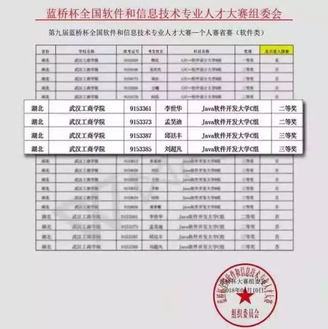 2019年,由工业和信息化部人才交流中心举办,教育部就业指导中心高度支持的“第十届蓝桥杯大赛”中,应用技术学院学子取得优异成绩:袁鑫杰、李子牧分别荣获蓝桥杯全国总决赛三等奖和优秀奖,且均获湖北省省赛一等奖,段文宇、吴杰等两名同学荣获湖北省省赛二等奖;徐桎韦、王立松、王昌杰、叶陈琛、黄兴意、肖凯等7名同学三等奖。