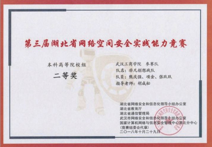 2018年,由湖北省网信办、湖北省教育厅、湖北省通信管理局、国家计算机网络与信息安全管理中心湖北分中心、武汉市网信办联合举办的第三届湖北省网络空间安全实践能力竞赛正式开赛,应用技术学院:熊庆颂、项金、张玖玖。